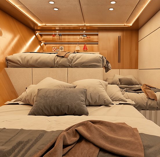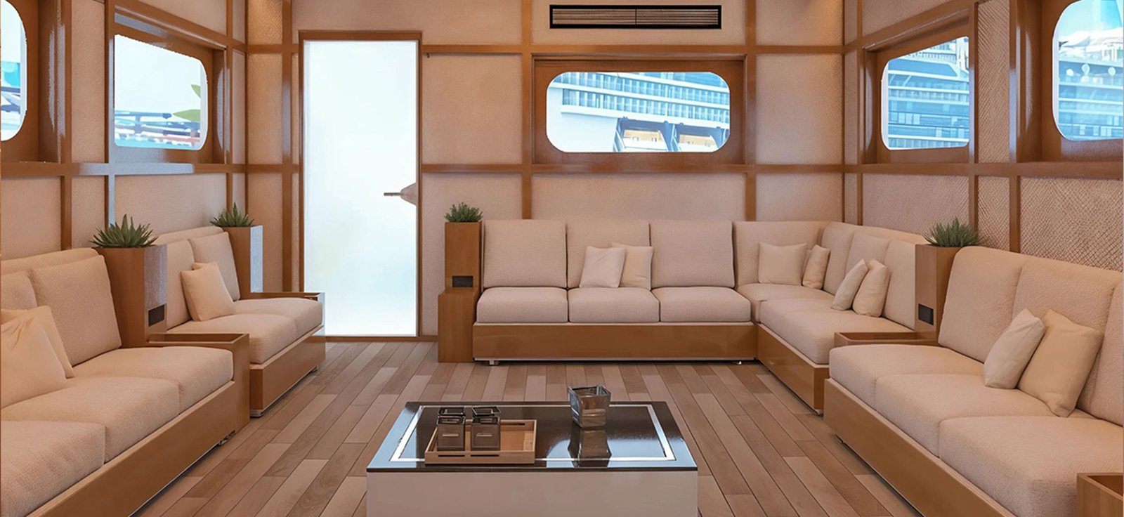 The Ajman Yacht project is an interior design commission deeply influenced by its coastal UAE setting. Ajman's calm waters and warm, luminous light informed every design decision, from the selection of sun-resistant, naturally textured materials to the open, fluid layout that draws the surrounding seascape into each space. The interior is designed to feel like a seamless extension of its environment: light-filled, unhurried, and quietly opulent. Whether at dock or at sea, life aboard this yacht feels entirely at ease with where it belongs.