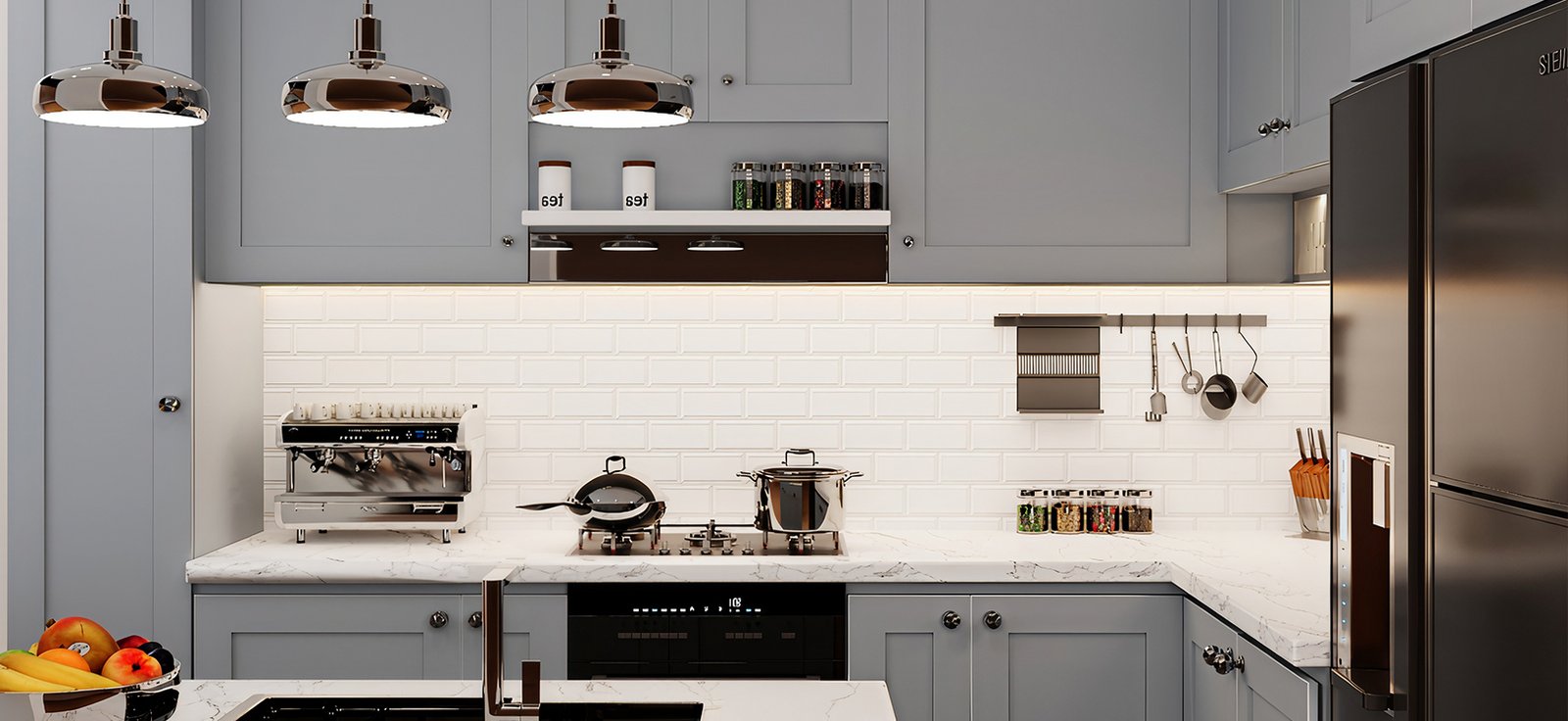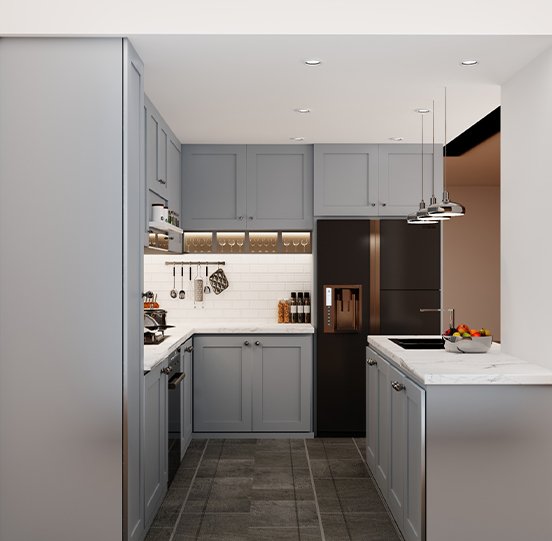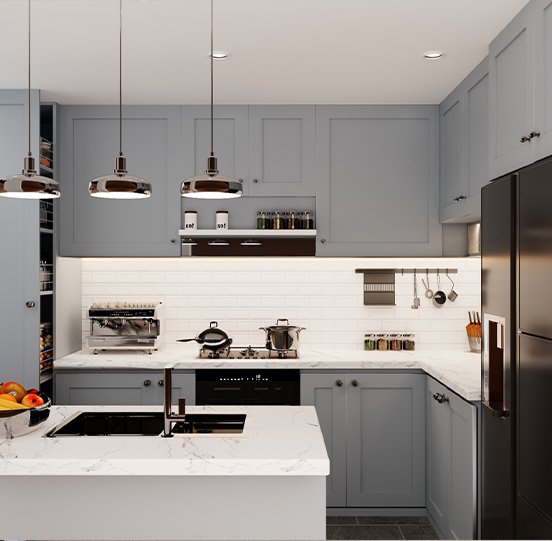 The Tehreen kitchen is a masterclass in monochromatic elegance. Designed around a refined palette of white, grey, and black, the space achieves a look that is simultaneously bold and serene, where crisp white surfaces bring light and openness, grey tones add depth and sophistication, and black accents deliver a sharp, contemporary edge. Every element was selected with precision: handleless cabinetry for a clean, uninterrupted silhouette, premium worktops that balance beauty with everyday durability, and lighting positioned to animate the kitchen's striking tonal contrasts. The result is a kitchen that feels as good to cook in as it does to simply be in.